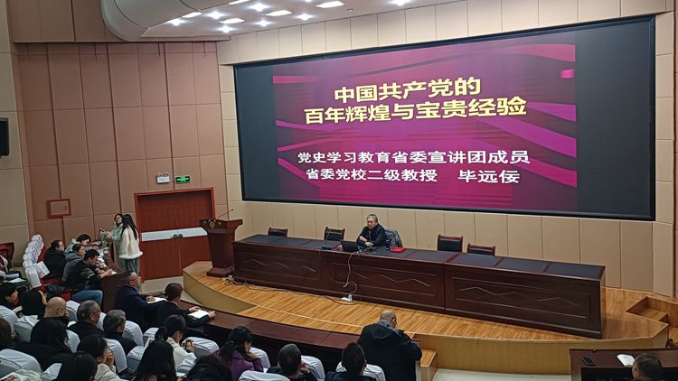 畢遠佞簡要介紹了自己的求學(xué)歲月、工作經(jīng)歷以及研究黨史的基本思路和方法。他表示,高校教師承擔(dān)的責(zé)任和肩負的使命很重要,應(yīng)該堅持讀原著、學(xué)原文、悟原理,自覺樹立正確的黨史觀,堅定歷史自信,增強歷史主動,積極引導(dǎo)學(xué)生形成正確的世界觀、人生觀、價值觀。此外,要堅持理論武裝同常態(tài)化長效化開展黨史學(xué)習(xí)教育相結(jié)合,做到學(xué)史明理、學(xué)史增信、學(xué)史崇德、學(xué)史力行。畢遠佞緊密圍繞中國共產(chǎn)黨的奮斗歷程、寶貴經(jīng)驗、學(xué)習(xí)黨的歷史踐行初心使命三個方面展開講解。他講到,《中共中央關(guān)于黨的百年奮斗重大成就和歷史經(jīng)驗的決議》將中共黨史劃分為四個歷史時期,每個時期都承擔(dān)著重要的歷史使命和任務(wù)。在一百多年的奮斗歷程中,中國共產(chǎn)黨形成了堅持黨的領(lǐng)導(dǎo)、推動理論創(chuàng)新、堅定“四個自信”、勇于“自我革命”等一系列寶貴經(jīng)驗。在新時代背景下,應(yīng)該繼續(xù)堅定理想信念,用黨的創(chuàng)新理論武裝頭腦、指導(dǎo)實踐和推動工作,著力解決人民群眾急難愁盼問題。