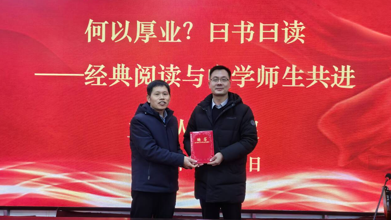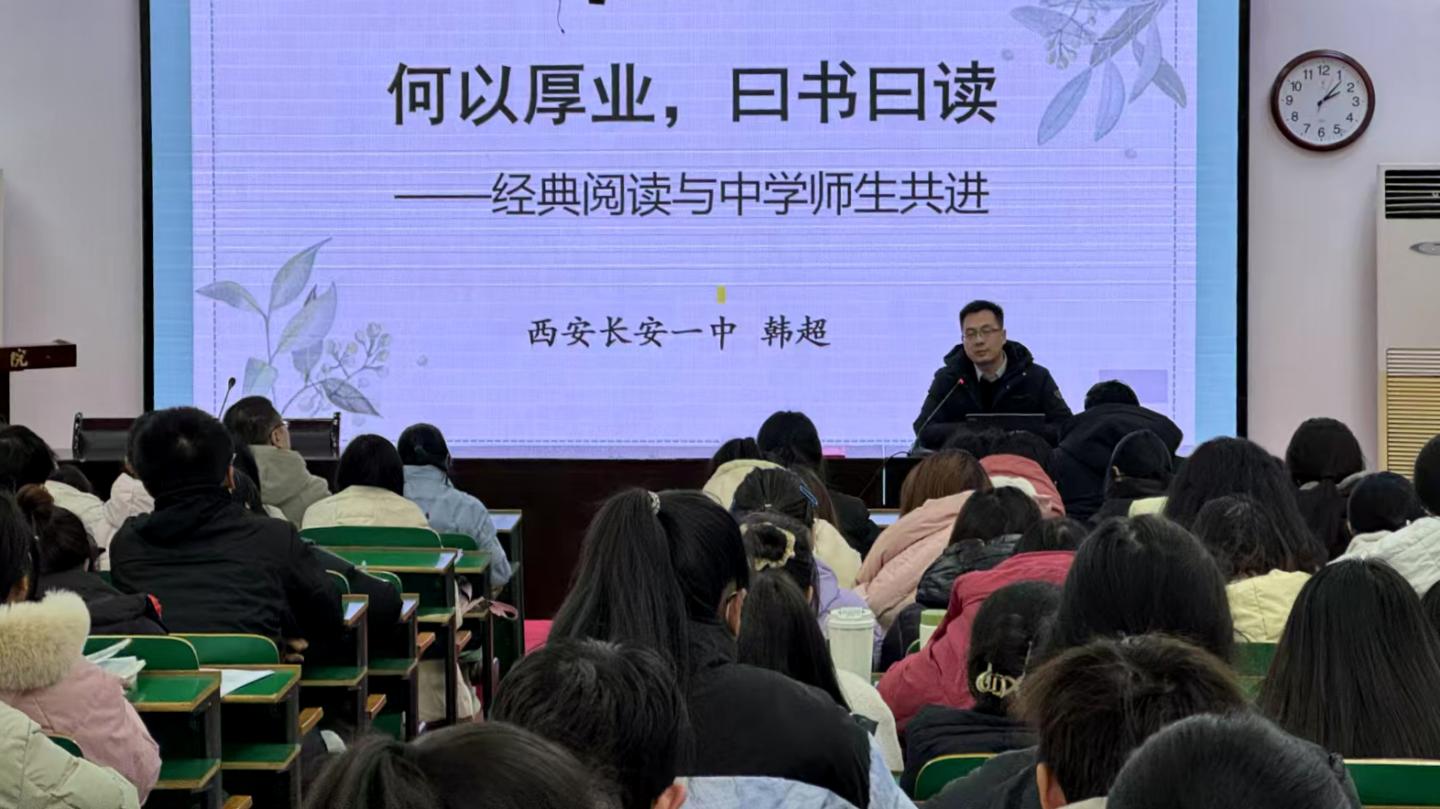 為進(jìn)一步提升師范生專業(yè)素養(yǎng),打造落地性更強(qiáng)的實(shí)踐學(xué)習(xí)平臺(tái),12月26日下午,人文學(xué)院邀請(qǐng)陜西省優(yōu)秀教師、中學(xué)語文高級(jí)教師、長(zhǎng)安一中副校長(zhǎng)韓超擔(dān)任主講嘉賓,為師生作實(shí)踐教學(xué)“經(jīng)典研讀”專題報(bào)告。人文學(xué)院院長(zhǎng)張文諾為韓超老師頒發(fā)漢語言文學(xué)專業(yè)授課專家聘書,副院長(zhǎng)張建軍、學(xué)院教師代表和2023級(jí)漢語言文學(xué)專業(yè)全體學(xué)生參加報(bào)告會(huì)。
