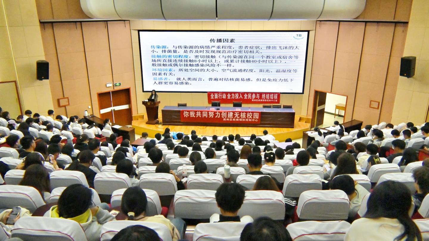 張曉榮首先從結(jié)核病危害、結(jié)核病的流行環(huán)節(jié)、結(jié)核病診斷治療預(yù)防三方面展開(kāi),結(jié)合生動(dòng)案例向師生進(jìn)行了深入講解,呼吁師生養(yǎng)成良好衛(wèi)生習(xí)慣,加強(qiáng)體育鍛煉,提高抵御疾病的能力。隨后,張曉榮向師生明確了結(jié)核病潛伏感染者的定義,她指出,結(jié)核潛伏感染并不等同于罹患結(jié)核病,預(yù)防性治療是降低結(jié)核病潛伏感染者發(fā)展為結(jié)核病患者的有效手段。
