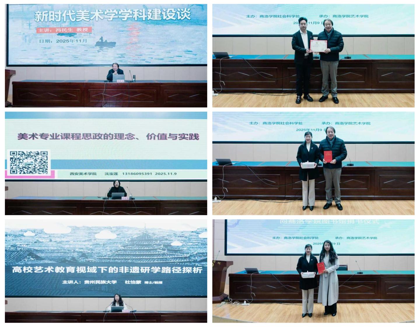 11月9日上午,陜西師范大學(xué)美術(shù)學(xué)院博士生導(dǎo)師馮民生教授、西安美術(shù)學(xué)院馬克思主義學(xué)院沈?qū)毶徑淌诤唾F州民族大學(xué)美術(shù)學(xué)院碩士生導(dǎo)師杜怡蒙教授應(yīng)邀為秦嶺學(xué)論壇作專題學(xué)術(shù)報(bào)告,圍繞秦嶺地域文化內(nèi)涵、秦嶺畫派創(chuàng)作研究、學(xué)科特色凝練、課程思政實(shí)施路徑以及非遺傳承創(chuàng)新等議題展開深入探討。藝術(shù)學(xué)院相關(guān)負(fù)責(zé)人、全體教師及美術(shù)學(xué)專業(yè)學(xué)生300余人現(xiàn)場聆聽了專家報(bào)告會。