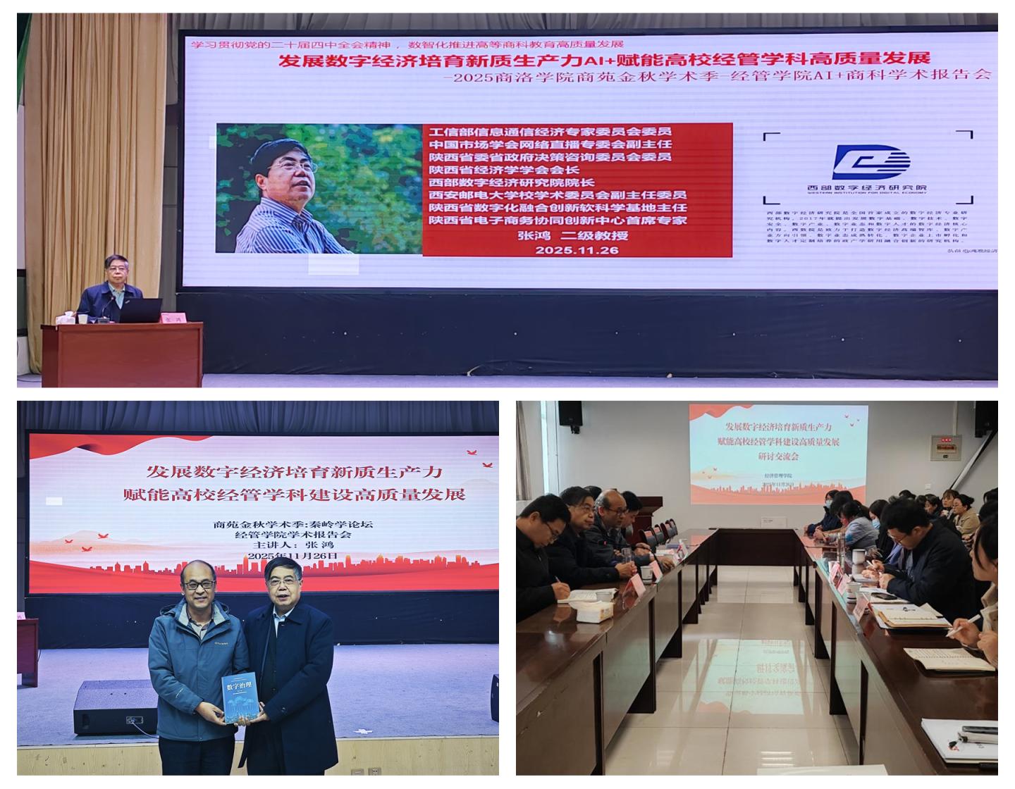 11月26日,經(jīng)濟管理學(xué)院在大學(xué)生活動中心舉辦專題學(xué)術(shù)報告會,西安郵電大學(xué)張鴻教授應(yīng)邀為學(xué)院師生作《發(fā)展數(shù)字經(jīng)濟培育新質(zhì)生產(chǎn)力賦能高校經(jīng)管學(xué)科建設(shè)高質(zhì)量發(fā)展》專題報告。學(xué)院班子成員、全院教職工及2025級全體學(xué)生參加了報告會。